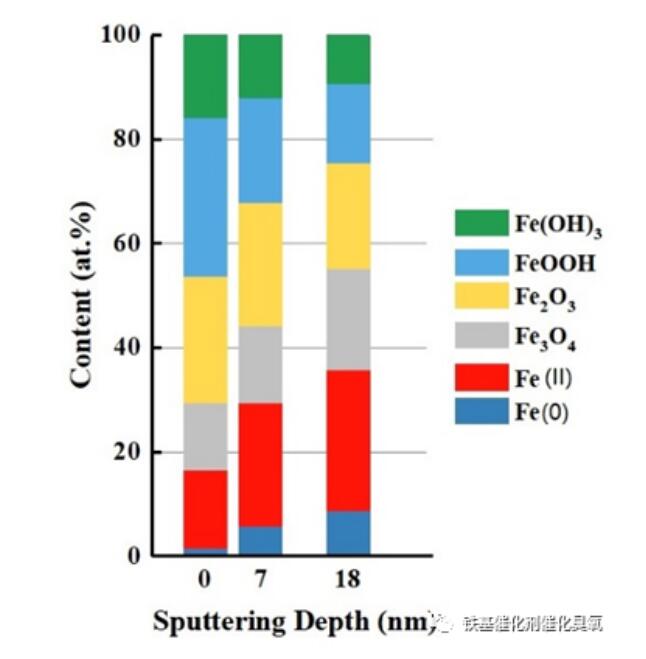 我們的鐵基催化劑與其他催化劑不同,不是通過“浸漬”、“燒結(jié)”等工序制備的;而是通過在液相中迅速氧化,使鐵刨花表面形成致密γ-FeOOH膜(當(dāng)然是相對(duì)的,詳見XPS蝕刻表征圖,表面以Fe(III)為主),成為臭氧分解的催化層;同時(shí),它又是內(nèi)部Fe(0)氧化的鈍化層。這種制備方法優(yōu)點(diǎn):一是工藝簡單,一步完成;二是表面主要成份為γ-FeOOH,催化臭氧效果好。而燒結(jié)方法,表面不會(huì)形成過渡金屬羥基化物(Me-OH),理論認(rèn)為:表面羥基(-OH)才是催化臭氧的有效官能團(tuán)。