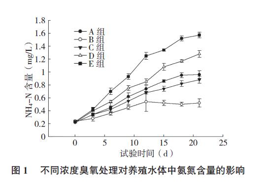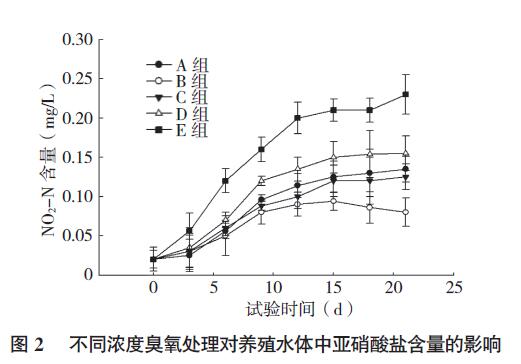由圖1、圖2 可知,各組水體氨氮和亞硝酸鹽含量都呈上升趨勢(shì)。與對(duì)照組(E 組)相比,經(jīng)過(guò)臭氧處理水體中的氨氮和亞硝酸鹽含量上升緩慢,可見臭氧對(duì)水體中的氨氮和亞硝酸有明顯的降解效果。B 組(0.1 mg/L 臭氧)水體的氨氮和亞硝酸鹽含量顯著低于其他幾組,而A 組(0.05 mg/L 臭氧)水體的氨氮含量和亞硝酸鹽含量雖然與C 組(0.15 mg/L 臭氧)相比差異不顯著,但高于C 組。可見,較低濃度臭氧對(duì)水體中氨氮和亞硝酸鹽降解效果不顯著,但其濃度也不是越高越好。