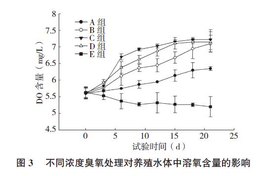 由溶氧含量結(jié)果(圖3)可知,使用臭氧處理育苗水體可以明顯提高水體中的溶氧含量,隨著臭氧濃度的增加,水體中的溶氧含量也不斷增加。D組水體溶氧含量略低于C 組,說(shuō)明臭氧雖然能提高水體中的溶氧含量,但若濃度太高,則水體中的殘留就會(huì)增加,且會(huì)產(chǎn)生氧化性副產(chǎn)物,對(duì)水生生物造成毒害,影響生產(chǎn)養(yǎng)殖的順利進(jìn)行。