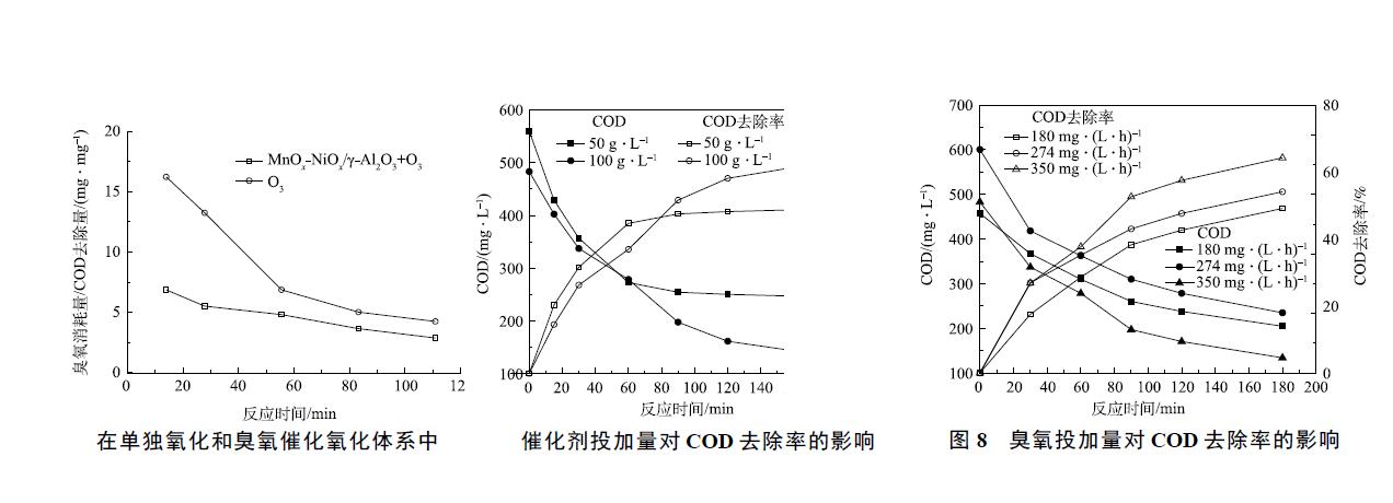 5) 連續(xù)進行4 h 的臭氧催化氧化實驗后發(fā)現(xiàn),MnOx-NiOx/γ-Al2O3 穩(wěn)定性和重復(fù)利用性較好,COD 去除率能維持在42% 左右不變,錳、鎳離子的溶出量均小于0.5 mg·L−1。