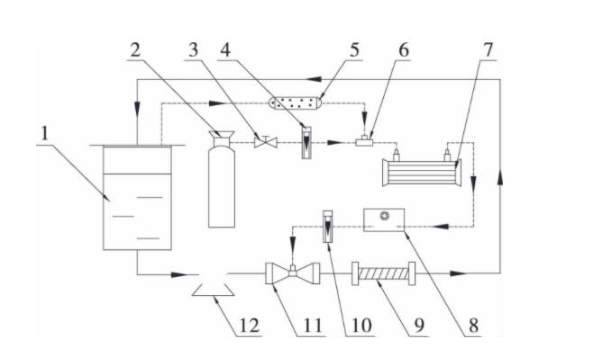 1. 儲液罐 2. 氧氣瓶 3. 減壓閥 4、10. 流量計 5. 干燥管 6. 三通閥 7. 臭氧發生器 8. 調節氣泵 9. 靜態混合器 11. 射流器 12. 離心泵